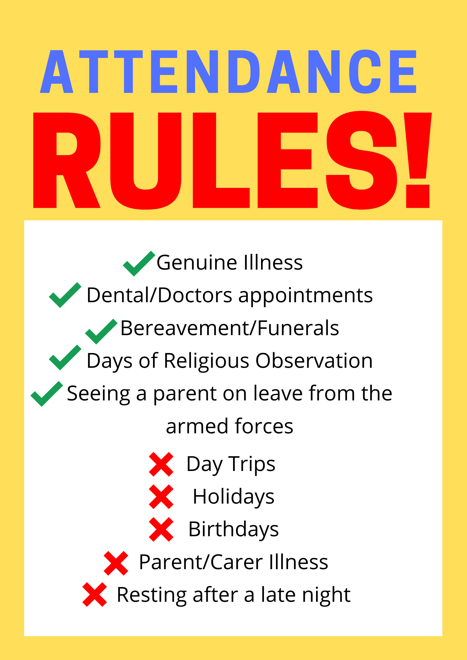 The law states that parents or carers must ensure that their child regularly attends school. Should you fail to ensure this then legal action may be taken against you.